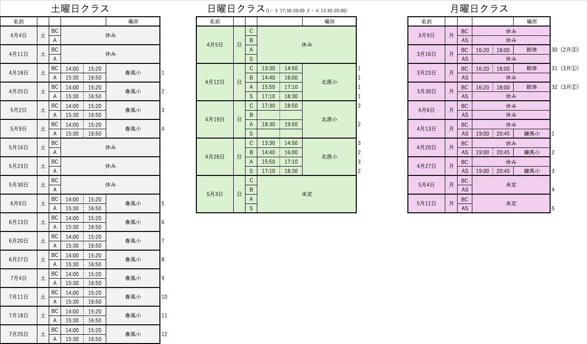 ※月曜BCクラスは9月までお休みです。